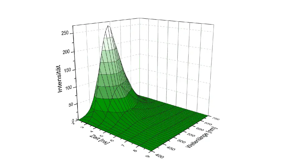 For 2D-resolved fluorescence spectroscopy, fluorescence emission spectra are usually recorded at continuously varying excitation wavelengths, thus creating an excitation/emission space. The vertical z-axis is formed by the fluorescence intensity. Combined with chemometric data analysis methods, applications in process analysis can be developed. A special standard feature of the LIMES fluorescence spectrometer is the ability to record 2D fluorescence spectra, whereby the decay behavior of the fluorescence is mapped on a nanosecond axis instead of the excitation wavelength. As the lifetime of the fluorescence is particularly sensitive to the structure and condition of the sample (binding state, pH value, microenvironment, aggregate state, etc.), this time dimension can be used to develop new analytical methods for a wide range of applications.