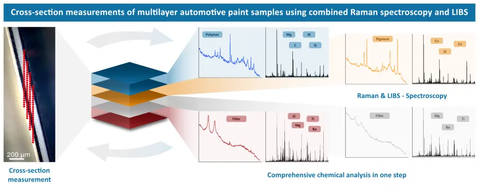 Our RAMAN-LIBS research group investigated the cross-sections of multilayer car paint samples. By using both techniques with our CORALIS system, LIBS with a nanosecond high energy pulse and Raman with a cw laser, both the elemental and molecular information and compositions become accessible. The ability to perform both measurements sequentially at the same measurement points provides a comprehensive picture of each layer. The approach can be a good additional option to established techniques for forensic analysis of car paint samples.